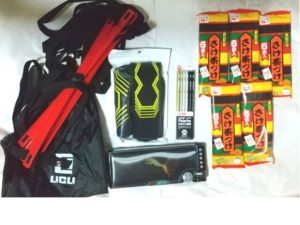 ラダー、トレーニングベルト、プーマの筆箱、えんぴつ1ダース、永谷園鮭茶漬け6P×5袋