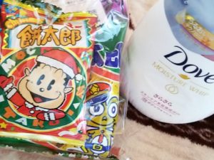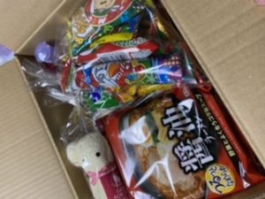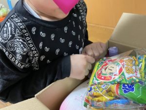 開けてみるとお菓子、ボディーソープと食料たくさん入っており1番喜んだのは息子でした😭