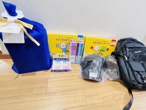 えほん4冊、目覚まし時計、リュック、帽子2つ、鉛筆24本、消しゴム24個