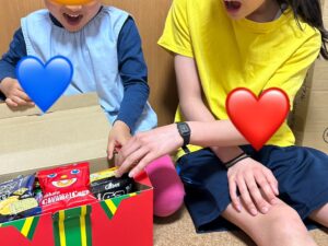 開けた瞬間に子どもの目が輝いて、うれしそうにお菓子を開…