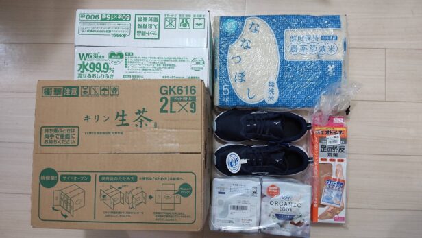 本日Amazonからスニーカー、インソール、おしりふき、おりものシート、お茶が届きました。