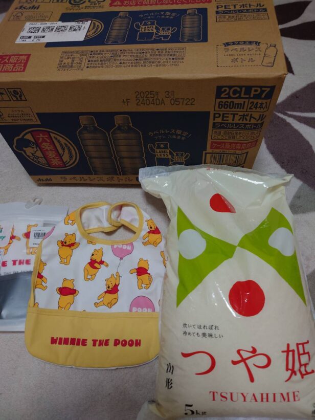 お米と麦茶と食事エプロンを頂きました。