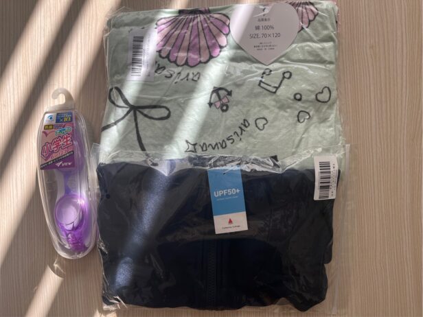 ギリギリ間に合い娘は可愛らしいバスタオルに好きな色のゴーグルに大喜びでした!