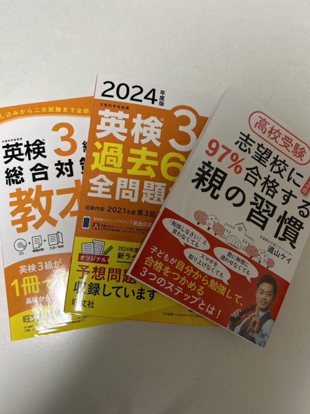 英検3級の参考書、過去問、受験生の親が読む本の3冊が届きました!