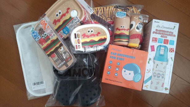 イヤーマフ、お弁当セット、サンダル、水筒、保冷バッグ、ランドセルカバーを送っていただきました。