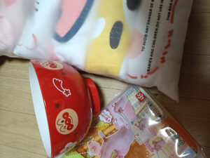 パンツ、お茶碗、お箸、クッションをいただきました。