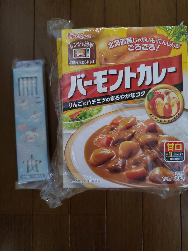 娘の入学で使う鉛筆とレトルトカレーをいただきました。