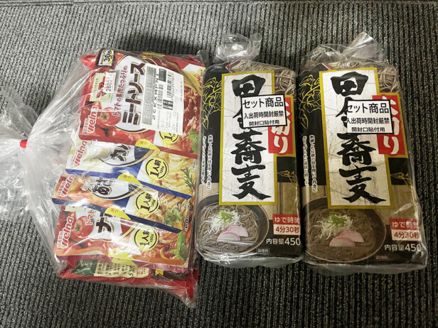 たくさんのパスタ、お蕎麦、冷凍食品。