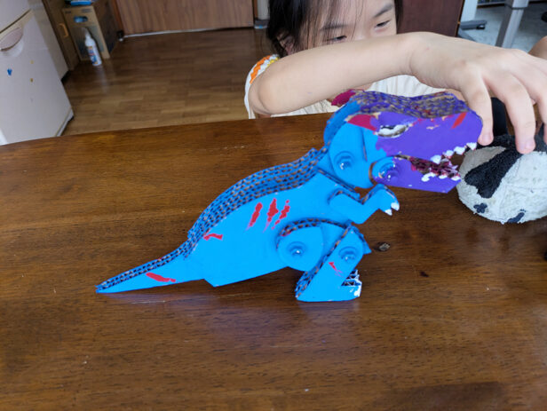 恐竜好きでもあり、ティラノサウルスを突起をつけて、アロサウルスに変え身体に引っ掻き傷をつけた塗装で作っています。